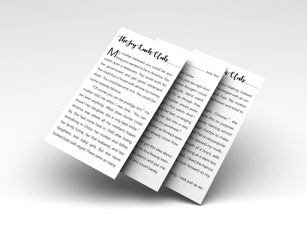 Redesign an existing book cover and redesign the front and back cover, the inside text and also a iPhone design of the text. The book I decided to do is the Joy Luck Club by Amy Tan.