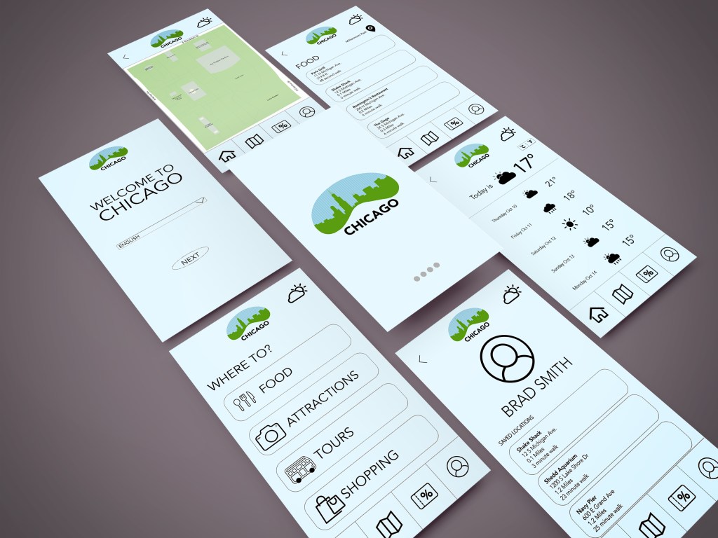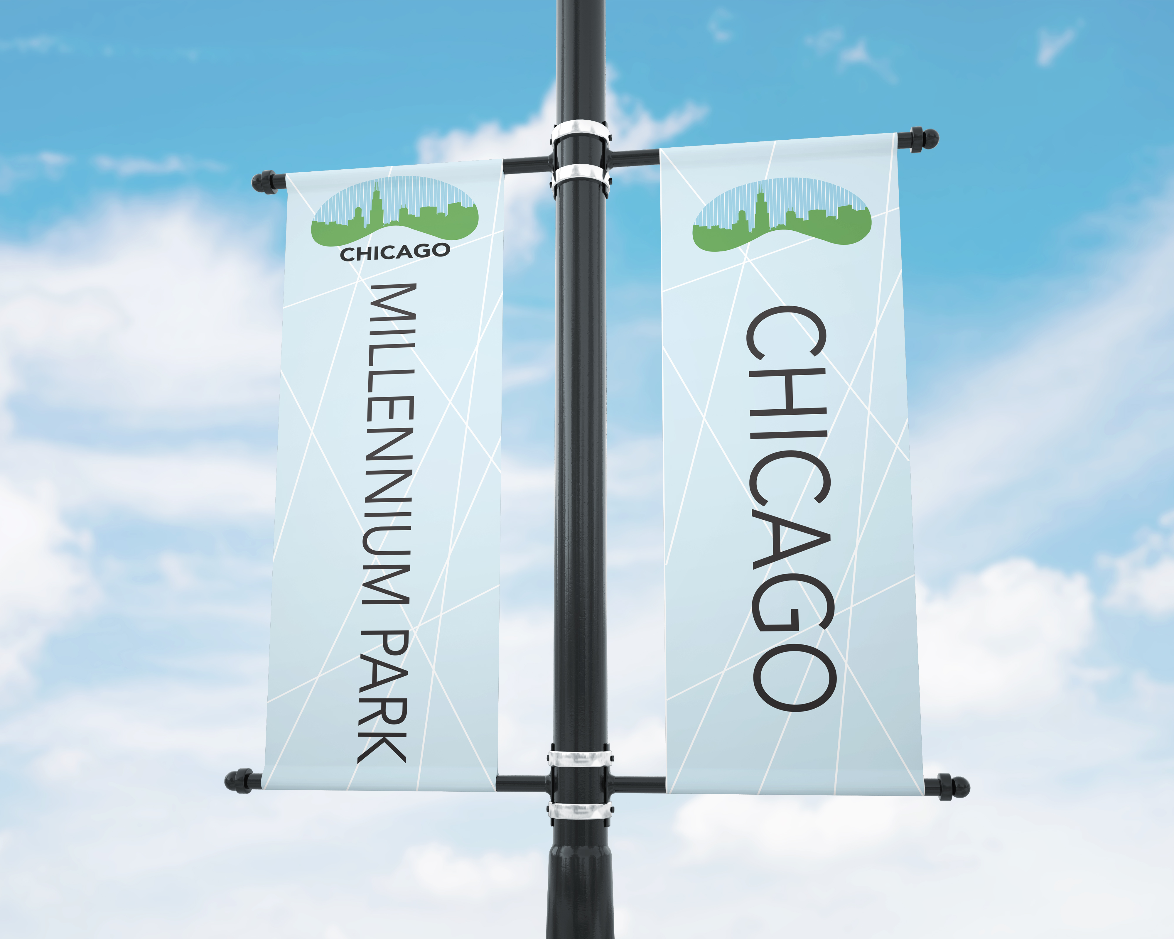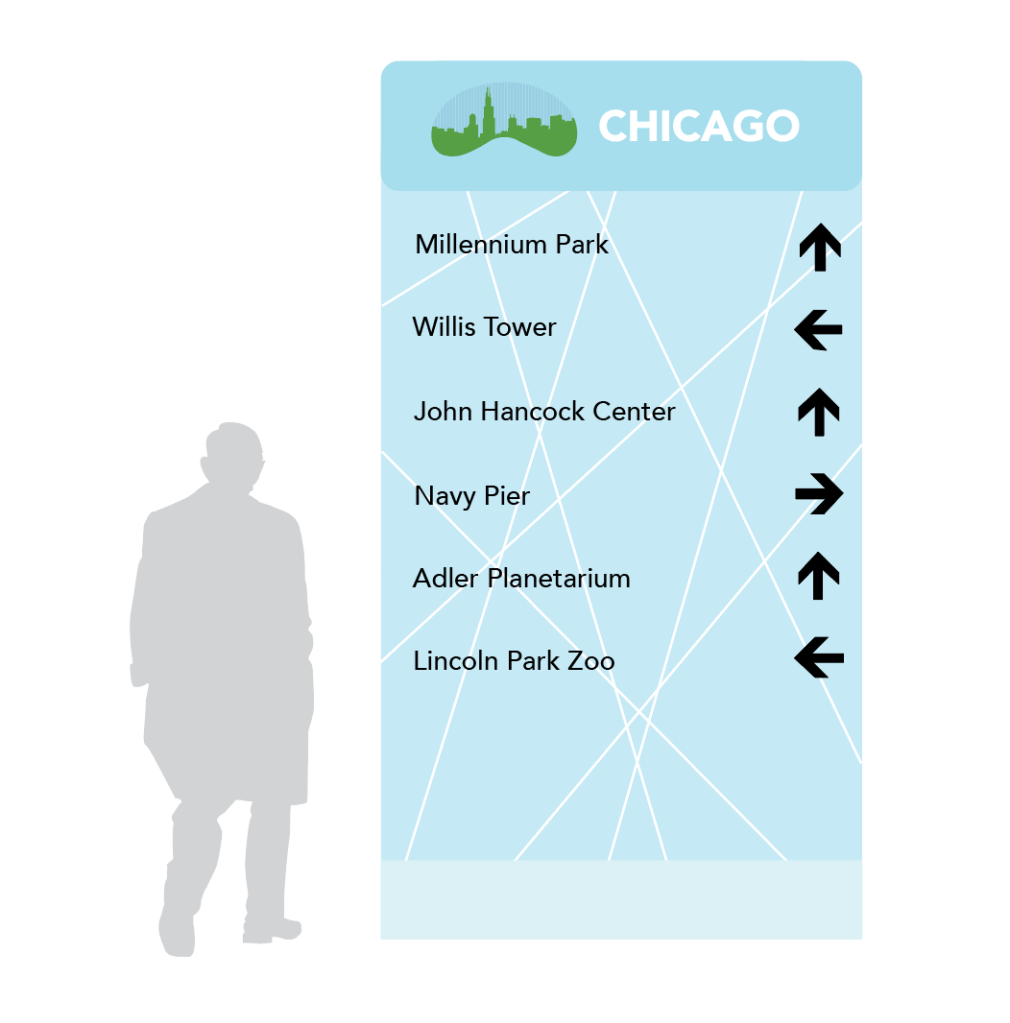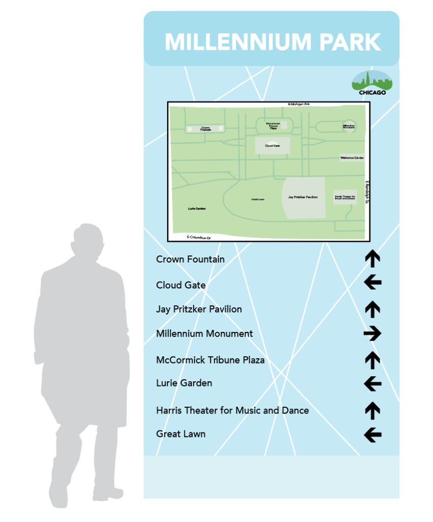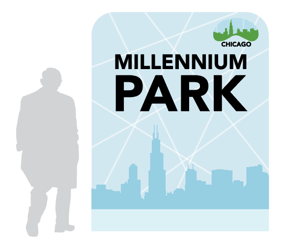 When creating the logo I wanted to have the bean sculpture that is in Chicago with the city skyline inside. To add more texture to the negative space, I added lines. To keep the lines consistent through the rest of the designs, I added lines going different directions on the wayfinding signages.
