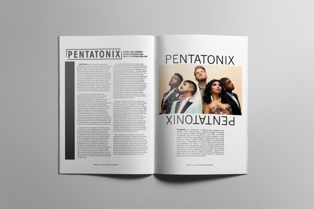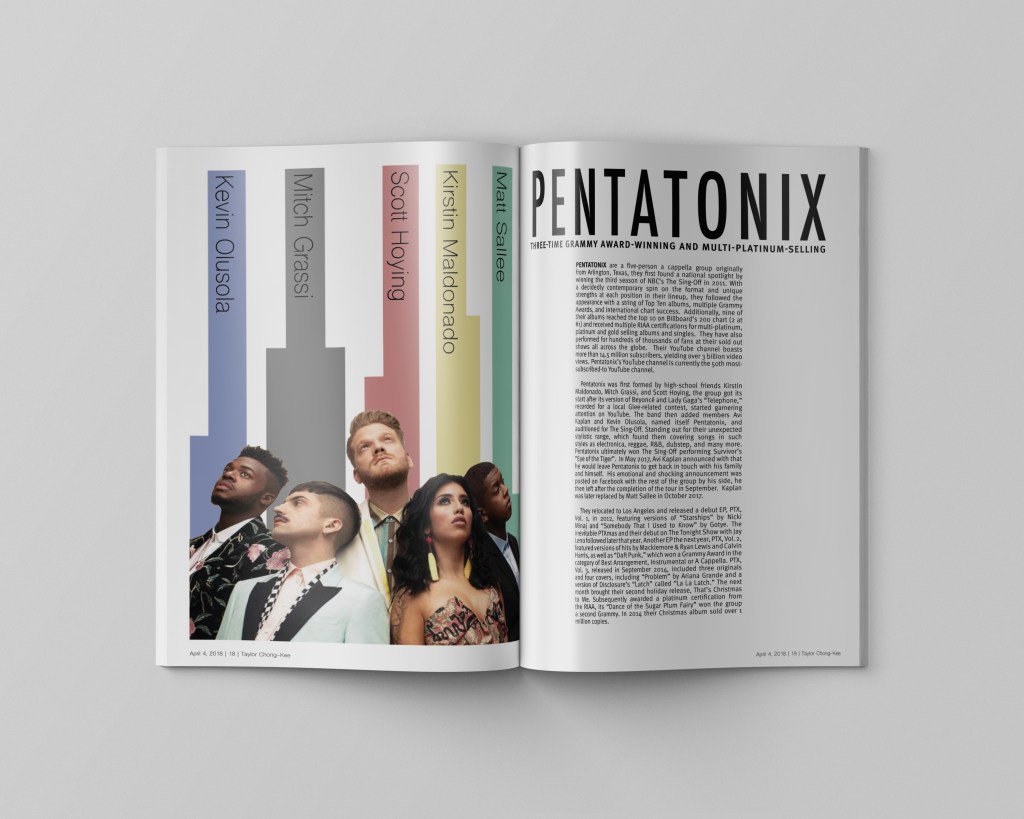 Choose a musician or group and design a promotion set. I decided to choose the acapella band called Pentatonix. The music set consists of 3 single page articles and double page spread that people would see in a magazine, a poster and a CD cover.