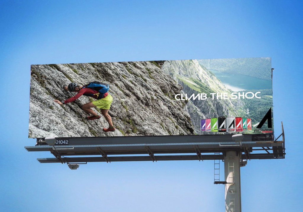 Make a billboard for a client assigned. Using photography, type and the clients logo and product.