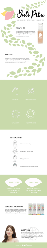 As a group, we have to create a product that contains cannabis (CBD) and create a marketing campaign. We decided to create a foundation called Yuli Pibu which means “glass skin” in Korean. The foundation helps people with different skin conditions like acne and rosacea.